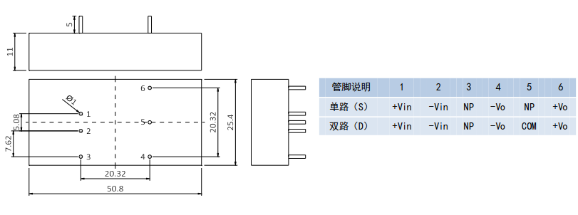 安裝尺寸(單位:mm)及管腳定義: