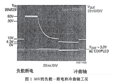 “冷曲軸”(cold crank)段,發(fā)生在汽車發(fā)動(dòng)機(jī)經(jīng)受冷卻或凝固期間,發(fā)動(dòng)機(jī)油變的非常粘滯。因而要求起動(dòng)機(jī)輸出更大的轉(zhuǎn)矩,相繼需要蓄電池提供更大的電流。這一大的電流負(fù)載導(dǎo)致蓄電池/一次母線的電壓降低,甚至低于4V的點(diǎn)火電壓。隨后,又回復(fù)至額定電壓13.8V(圖1)。這在某些應(yīng)用場(chǎng)合,例如發(fā)動(dòng)電機(jī)控制、安全系統(tǒng)和導(dǎo)航系統(tǒng)均不可避免。故要求具有良好調(diào)節(jié)的輸出電壓(一般為3.3V)貫穿“冷曲軸”段,以實(shí)現(xiàn)全過程的無間斷(連續(xù))運(yùn)行。