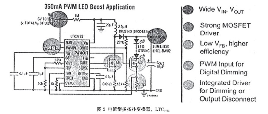 裝有LTC3783 LED驅(qū)動(dòng)器在汽車上應(yīng)用時(shí),具有以下很重要的特點(diǎn):(1)大電流、為輸出大的電流(≥1.5A),LTC3783驅(qū)動(dòng)外部的N溝道MOSFET,可給高亮度(HB)和超高亮度(SHB) LED供電;(2)高電壓、LTC3783 3V~36V的輸入運(yùn)作和輸出電壓,取決于外部功率元件的選擇,這可按標(biāo)準(zhǔn)確定,易于驅(qū)動(dòng)LED燈串或混串(串+并);(3)保護(hù)。對(duì)HB LED的保護(hù),需要IC結(jié)合精確的電流和輸出電壓調(diào)節(jié)。附加保護(hù)包括過電壓、過電流和軟啟動(dòng);(4)調(diào)光、以純色PWM3000∶1數(shù)字式調(diào)光時(shí),在寬廣的調(diào)光比下保持LED恒定的顏色。而且,LTC3783還能附加模擬100∶1的調(diào)光。