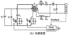 伴隨著開關電源開關操作時急劇的電壓和電流變化而產生的浪涌和噪聲將作為傳導噪聲或輻射噪聲傳遞至設備的外部,從而引發電磁干擾(EMI)問題。傳導噪聲(特別是共模噪聲)中也時常會產生很大的環路電流,這是輻射噪聲的起因。近幾年來,ZVS(零電壓開關)和ZCS(零電流開關)等軟開關(SoftSwitching)技術作為抑制浪涌發生的常規方法已經廣為人知。不過,人們在此基礎上又提出了多種能夠兼顧低功耗和低噪聲目標的電路方案。圖5(a)示出了采用有源鉗位電路的傳統型轉換器電路。鉗位開關Q2需要在高壓側進行絕緣驅動,這里通常采用的是脈沖變壓器。然而,如圖5(b)所示,研究人員最近又提出了一種共源極型有源鉗位電路方案,它將兩個MOSFET開關的源極端子共接,從而簡化了柵極驅動。不僅如此,這種共源極型電路方式還有望降低噪聲,經實驗測量,其噪聲電平較之傳統型電路下降了約30dB。