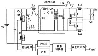 日本的研究人員開發成功一種振動型壓電變壓器,其厚度僅為4mm。該壓電變壓器的驅動電路采用方波逆變器,通過改變其開關頻率(PFM方式)以達到借助壓電變壓器的諧振特性來調整輸出電壓的目的。但是,由于壓電變壓器具有多種由其形狀所決定的諧振頻率,所以很難通過大幅度地改變頻率的做法來控制輸出電壓。為此,人們正在研究引入逆變器的脈寬調制(PWM)技術。圖7示出了通過將驅動用逆變器、采用電流倍增器的整流電路以及采用PFM和PWM方式的混合控制電路與壓電變壓器相連而構成的壓電變壓器DC/DC轉換器。
