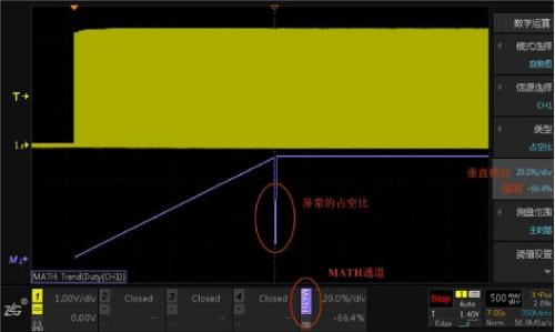 這個(gè)時(shí)候用ZDS4000系列示波器新開(kāi)發(fā)獨(dú)特的占空比趨勢(shì)測(cè)量功能,將每一個(gè)PWM波的占空比顯示在屏幕上,點(diǎn)擊示波器數(shù)學(xué)運(yùn)算Math按鍵,模式選擇趨勢(shì)圖,類(lèi)型選擇占空比,示波器會(huì)自動(dòng)檢測(cè)PWM波的周期和閾值,無(wú)需過(guò)多設(shè)置,就可以快速出波形,波形如圖5所示。屏幕上除了通道1,還多了MATH通道,顏色為紫色,MATH通道顯示的即是占空比趨勢(shì),可以看到占空比緩慢遞增后大約在屏幕中間位置出現(xiàn)了異常。和通道1一樣,MATH通道也可以調(diào)節(jié)垂直檔位和偏移。