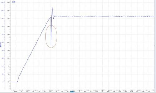 某使用PWM波形驅(qū)動(dòng)的直流電機(jī)在加速過(guò)程中存在微小抖動(dòng)情況,觀察電機(jī)轉(zhuǎn)速波形如圖3所示,開(kāi)始加速后大約在3.6秒轉(zhuǎn)速出現(xiàn)一個(gè)下拉動(dòng)作。電機(jī)PWM調(diào)速原理是通過(guò)改變接通脈沖的寬度,使直流電機(jī)電樞上電壓的占空比改變,從而改變電樞電壓的平均值,控制電機(jī)的轉(zhuǎn)速。因此基本可以確定這個(gè)轉(zhuǎn)速下拉動(dòng)作是由于PWM波占空比出現(xiàn)異常引起的。