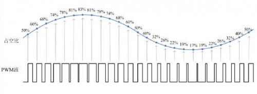 脈沖寬度調(diào)制(PWM)是一種對(duì)模擬信號(hào)進(jìn)行數(shù)字編碼的方法。通過(guò)高分辨率計(jì)數(shù)器的使用,方波的占空比被調(diào)制用來(lái)對(duì)一個(gè)具體模擬信號(hào)進(jìn)行編碼。PWM信號(hào)仍然是數(shù)字的,因?yàn)樵诮o定的任何時(shí)刻,滿(mǎn)幅值的直流供電要么完全有(ON),要么完全無(wú)(OFF)。電壓或電流是以一種通(ON)或斷(OFF)的重復(fù)脈沖序列被加到模擬負(fù)載上去。通的時(shí)候即是直流供電被加到負(fù)載上的時(shí)候,斷的時(shí)候即是供電被斷開(kāi)的時(shí)候。只要帶寬足夠,任何模擬值都可以使用PWM進(jìn)行編碼。而占空比就是高電平持續(xù)時(shí)間與整個(gè)周期時(shí)間的比值,占空比越大,高電平持續(xù)的時(shí)間越長(zhǎng),模擬電路開(kāi)通的時(shí)間就越長(zhǎng),如圖1所示。