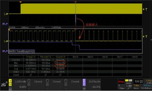定位到占空比異常位置后,開(kāi)啟示波器縮放模式下ZOOM多窗口顯示功能,對(duì)信號(hào)進(jìn)行局部放大,如圖6所示,可以清晰的看到占空比異常的細(xì)節(jié),同時(shí)開(kāi)啟對(duì)ZOOM1窗口數(shù)據(jù)的測(cè)量和統(tǒng)計(jì),可以看到占空比從正常的59.62%變?yōu)?.99%左右。
