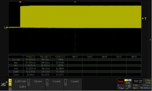 示波器的存儲(chǔ)深度對(duì)占空比趨勢(shì)測(cè)量影響很大,所謂趨勢(shì)趨勢(shì),即是長(zhǎng)時(shí)間的變化動(dòng)向,如果存儲(chǔ)深度小,那么所記錄的時(shí)間就很短,采樣的波形也就很少,對(duì)于分析趨勢(shì)就沒(méi)有意義。目前ZDS4000系列示波器存儲(chǔ)深度高達(dá)512Mpts,可以在高采樣率下存儲(chǔ)數(shù)十秒的波形,比較適合分析信號(hào)變化趨勢(shì)。