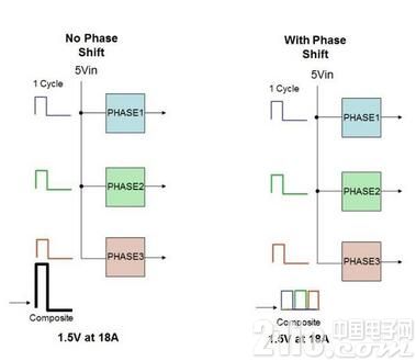 圖2:同相和異相配置三相DC轉換器對比。