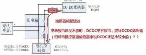 電機(jī)控制器的電容出了問題,不足負(fù)載需求,需要快速充電時(shí)DC/DC內(nèi)的電容放電了(電流往回走),所以導(dǎo)致這個(gè)熔斷器損壞。