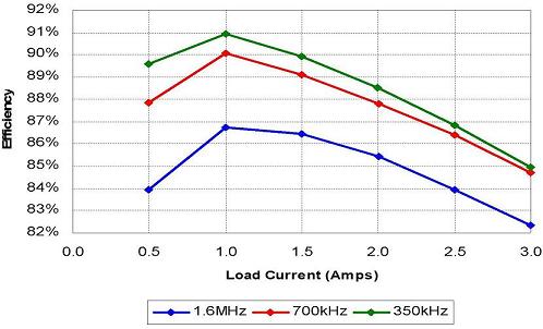 我們來對比一下這三種頻率分別為的350, 700和1600 kHz的電源的利弊。三種方案都使用頻率1.6 MHz、低電壓、帶MOSFET的TPS54317型3 A同步降壓DC/DC轉換器作為調壓器。