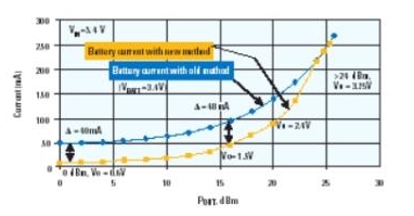 圖3:當功率放大器使用DC-DC轉換器供電時,電池電流的節省情況 |