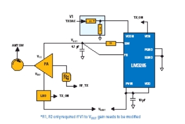 實例:在VIN=4.2V、V o=3.4V、Io =400mA(高射頻功率)時,LM3205的效率達到96%,在VIN=3.9V、V o=1.5V、I o=100mA(低射頻功率)時,效率為87%。