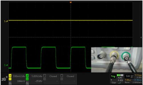 測試方法:通道1測量小信號(100mv/div),通道2測量大信號(5V/div),觀察信號互相影響的情況。