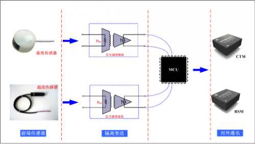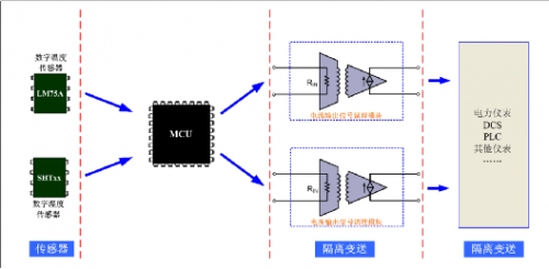 如圖 3所示,MCU處理數字溫度、濕度傳感器的信號,處理完畢后,通過信號調理模塊隔離,再傳送出去,以便跟現場的電流輸入,或電壓輸入型電力儀表相連,同時具備隔離的功能,防止傳感器前端的干擾信號串入現場的電力儀表、PLC,DCS等。