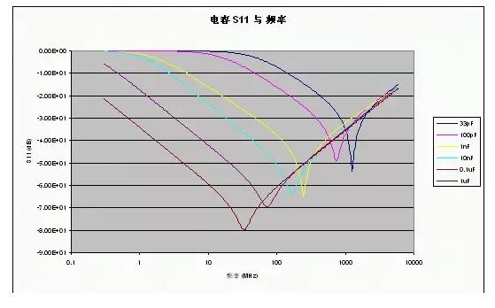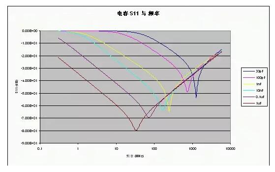 給出了不同容值下的典型S11參數(shù),從這些曲線可以清楚地看到SRF,還可以看出電容越大,在較低頻率處所提供的去耦性能越好(所呈現(xiàn)的阻抗越低)。