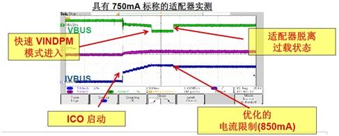 其次,能夠?qū)崿F(xiàn)97%的效率得益于TI獨特的ICO算法,ICO能夠?qū)崟r檢測適配器的電流能力大小。文司華博士做了詳細解釋,“如上圖所示,這是我們的VBus,當接入電池后發(fā)生了一些變化。接入電池后就開始充電了,作為ICO模式,作為比較小的電流去測,比如500毫安開始啟動了,在500毫安時適配器很舒服地進行工作,當電流逐漸上調(diào)了以后,我們會發(fā)現(xiàn)Bus電壓突然掉下來了,它能掉下來并且保持在這個模式下,VEDPM模式啟動了,在這個模式里,適配器實際上已經(jīng)過載了,由于VEDPM功能的保護,適配器雖然過載但還能工作,因此這個點能夠保持,但這不是最理想的狀況,原因是它讓適配器過載了,適配器會發(fā)燙的,最好的處理辦法是讓適配器能夠脫離這個狀態(tài),ICO功能能夠讓電流再退回一點,等它退回一點,這個適配器就脫離過載狀態(tài)了。”