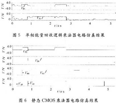 從圖中可見,用靜態CMOS電路構成的乘法器輸出比較穩定,輸出等于0或VDD,功率消耗為1.51×10-7W。而用單相能量回收電路構成的二位乘法器的輸出不夠穩定,對噪聲信號較為敏感,但是并不影響輸出邏輯,功率消耗減小為1.17×10-7W。從節能的角度來看,單相能量回收電路性能更好。