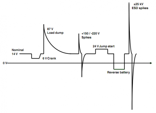 最有威脅的電壓瞬變是由拋負載和跳啟動引起的電壓瞬變,但所有其他危害都可能影響電子模塊的正常運行。