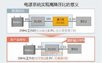 然而,車載系統必須保持2MHz工作,而能夠從48V直接降壓到驅動ECU(Electronic Control Unit)所需的3.3V或5V的電源IC并不存在,需要制造12V等中間電壓,進行2步降壓。