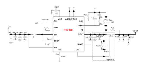 ①.HT7178的輸入電壓范圍是2.7V到15V, 輸出電壓范圍是4.5V到20V。該芯片集成了兩個低導(dǎo)通電阻的功率MOSFET:一個11m?6?8開關(guān)FET和一個13m?6?8整流器FET,使用具有集成斜坡補(bǔ)償功能的固定頻率峰值電流模式控制。HT7178 PFM,PWM兩種模式可選,匹配不同的應(yīng)用場合,提高效率。