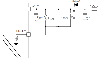 從上圖我們可以看到,所需要的外部器件很少。該芯片還提供一個單獨(dú)的 pin 腳 DIS來驅(qū)動負(fù)載輸出端的外部 FET(P-FET),在設(shè)備關(guān)斷或者輸出短路時(shí)它能完全斷開輸入與輸出的連接。啟動時(shí),通過內(nèi)部電流源來控制外部 P-FET 開關(guān)。在關(guān)斷或者輸出短路時(shí),將輸出與輸入側(cè)隔離,如下圖: