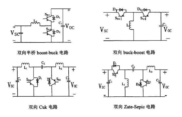 非隔離雙向DCDC,結(jié)構(gòu)比較簡單,每個(gè)部件都是直接相連,沒有額外的能量損失,工作效率比較髙。對升壓側(cè)的電容要求比較高。主要的非隔離DCDC電路結(jié)構(gòu)有雙向半橋boost-buck電路,雙向buck-boost電路,雙向buck電路,雙向Zate-Sepic電路,如下圖所示。