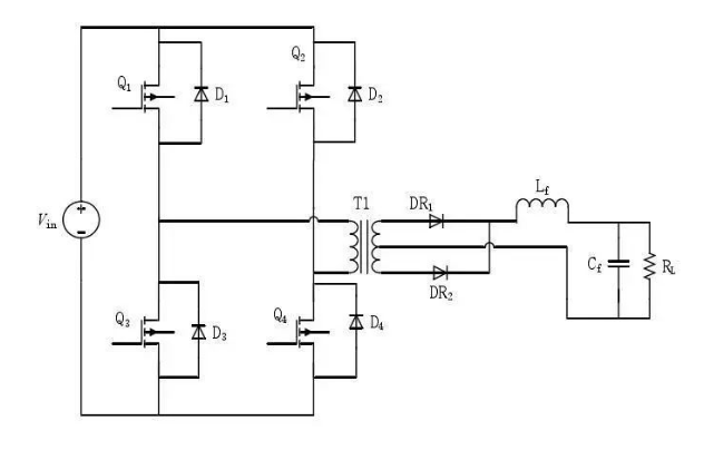 上圖中,Vin為輸入電壓,需要通過DCDC回路,在輸出端得到一個(gè)需要的輸出電壓。原邊開關(guān)電路,將輸入電流調(diào)制成矩形波,這個(gè)過程主要依靠控制器調(diào)制特定占空比的PWM波,用以驅(qū)動四個(gè)開關(guān)管按照既定的順序和時(shí)間開閉,從而實(shí)現(xiàn)電流逆變過程。原邊輸入電壓可以通過占空比調(diào)節(jié),占空比增加輸出電壓也增加,占空比減小輸出電壓減小。頻率則可以通過調(diào)節(jié)開關(guān)頻率調(diào)節(jié)。T1位變壓器,變比你n。變壓器既可以實(shí)現(xiàn)電氣隔離,又可以起到電壓調(diào)節(jié)的作用。一個(gè)固定的原邊線圈匝數(shù),副邊改變匝數(shù),即可得到不同的電壓等級。變壓器的輸入,是經(jīng)過左側(cè)全橋電路逆變得到的脈沖矩形波,傳遞到變壓器的副邊,得到的是另一個(gè)電壓幅值的交流正弦波。經(jīng)過DR1和DR2整流以后,再經(jīng)由Cf和Rl濾波處理,得到直流電,提供給輸出端。