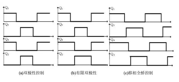 進(jìn)一步的,軟開關(guān)包括三種控制方式:雙極性控制,有限雙極性控制,移相全橋控制,得到的矩形波波形如下圖所示。
