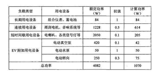 根據(jù)純電動汽車車載電子設(shè)備的不同屬性,能把用電設(shè)備分為長期用電、連續(xù)用電、短時(shí)間間歇用電和附加用電設(shè)備種類型,并賦于不同的權(quán)值。其中,長期用電設(shè)備包括組合儀表和蓄電池,權(quán)值取1;連續(xù)用電設(shè)備包括雨刮、電機(jī)、音響系統(tǒng)和儀表照明等設(shè)備,權(quán)值可取0.5;短時(shí)間間歇用電設(shè)備包括電喇機(jī)、各類信號燈、控制器等設(shè)備,權(quán)值可取0.1;附加用電設(shè)備電動真空泵、電動水泵和電動轉(zhuǎn)向,權(quán)值根據(jù)實(shí)際情況分別取0.1、1、0.3。各類設(shè)備所消耗功率分析如表所示。