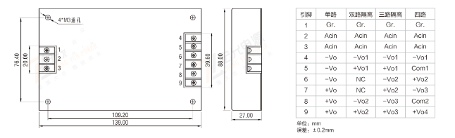 | 安裝尺寸(單位:mm)及管腳定義: |
